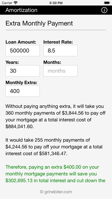 The app was inspired by the popular Grinebiter.com Amortization Calculator web application. We took what we learned from our web visitors to make this very useful iOS Apple app. The app is fast, intuitive, and easy to use. It is a standalone app, which means that it will work perfectly fine in places with little or no Internet access.