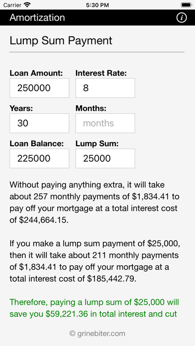 You can substantially reduce the number of monthly payments and total interest cost of your loan by either paying a fixed extra amount every month, or paying a large one-time lump sum. This app also includes an Extra Monthly Loan Payment Calculator and a Lump Sum Loan Calculator so you can calculate your potential savings.