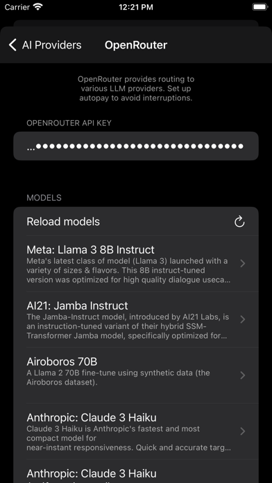 OpenRouter support: bring an OpenRouter API key to chat with every model on the web. Just sign in by creating an account over at OpenRouter and paste it in to Apollo to access nearly every model, from open source models like Meta Llama 3, to closed source models like OpenAI’s ChatGPT-4.