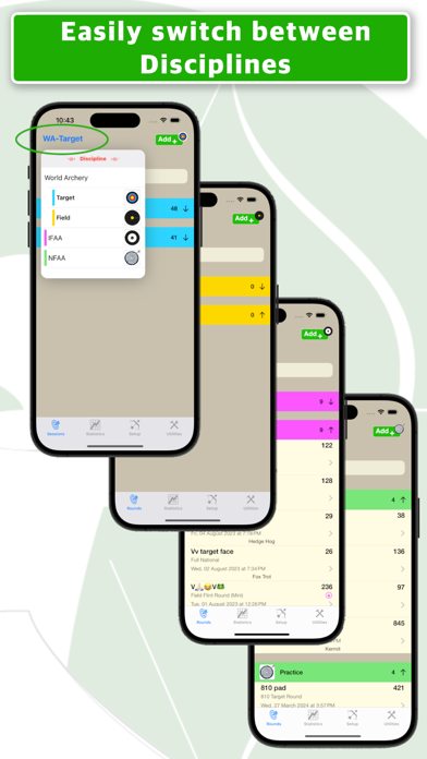 Each discipline has its own set of rules and target face designs, select your discipline and start scoring. The shoots you record remain in their respective discipline so that you are able to draw statistics on each.