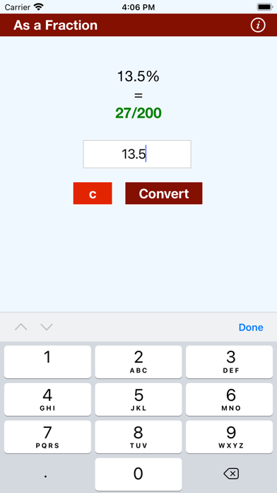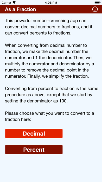 This powerful number-crunching app can do two things very well. It can convert decimal numbers to fractions, and it can convert percents to fractions. The fractions (or mixed numbers) are given in the simplest form possible.
