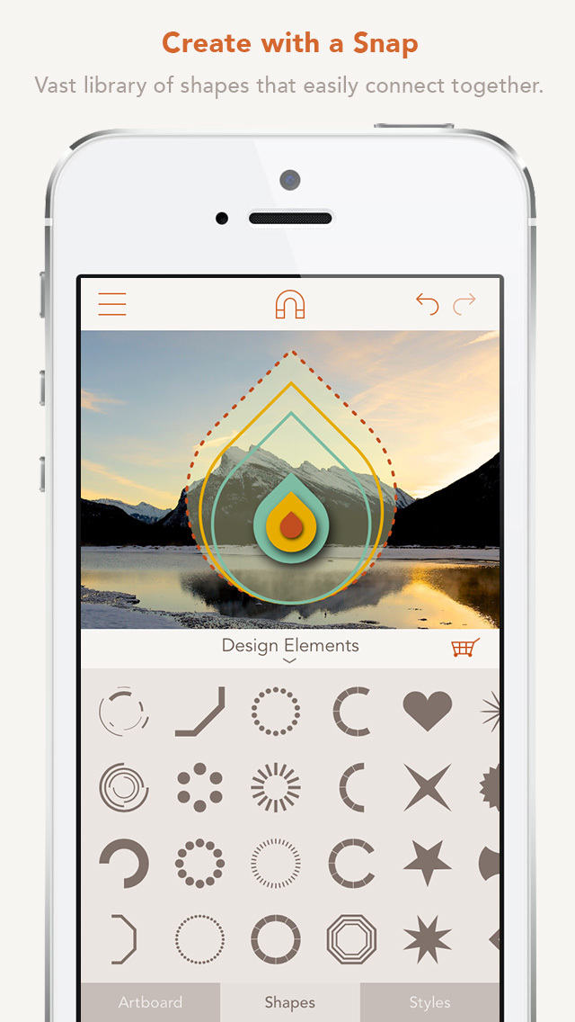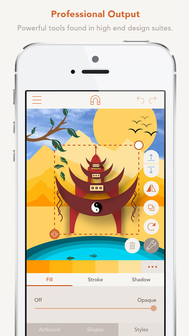 Designing something beautiful is as easy as placing premade shapes on the screen. The artwork you create can be exported as high resolution images or vector objects that can be blown up to any size. From T-shirts to posters or even billboards.