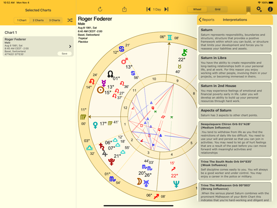 * Display zoomable, high-resolution single, bi or tri chart wheels and single or bi aspect grids