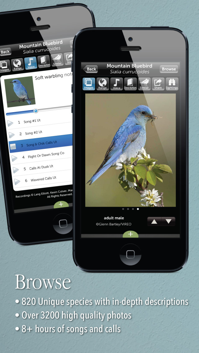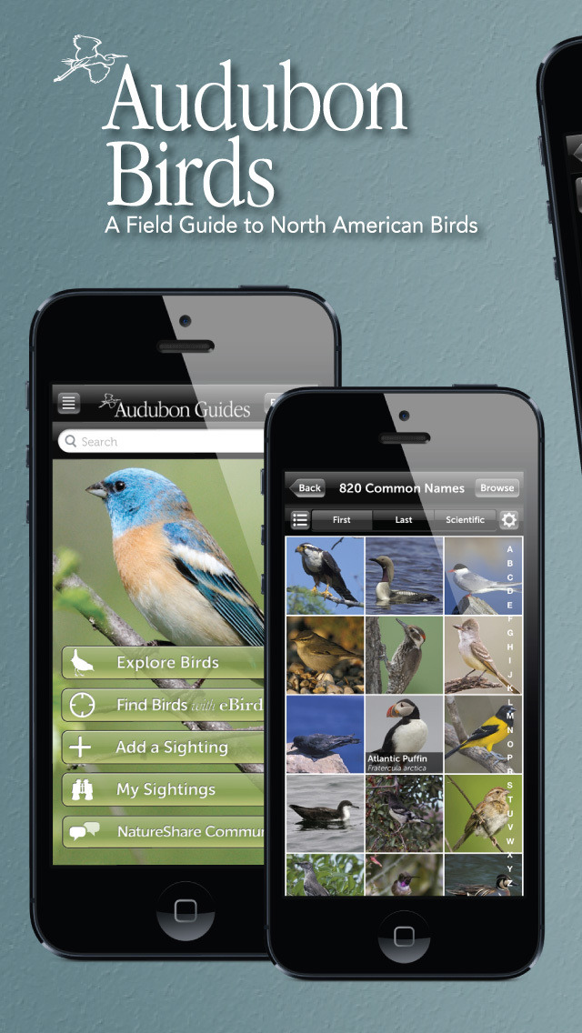 Audubon Bird Guide: North America is an outstanding mobile field guide resource completely updated to the current AOU checklist. The app includes 821 species; advanced gallery view for easy comparison and search; field mark call outs; a “Find Birds with eBird” feature powered by the Cornell Lab of Ornithology; and a social community of birders who observe, identify, and share their observations and photos in the mobile app and online.