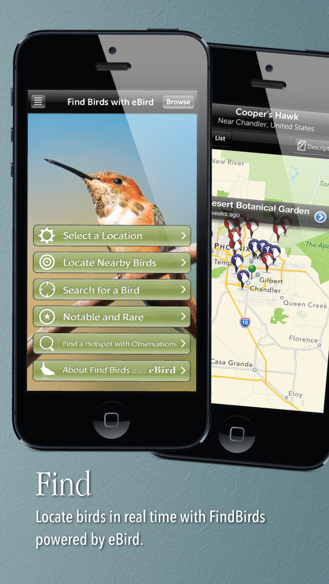 •Find Birds with eBird - the ability to locate birds seen recently around you, drawing on the continuously updated database from the Cornell Laboratory of Ornithology and eBird.