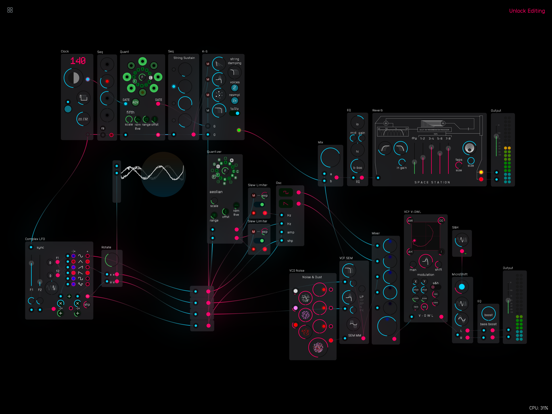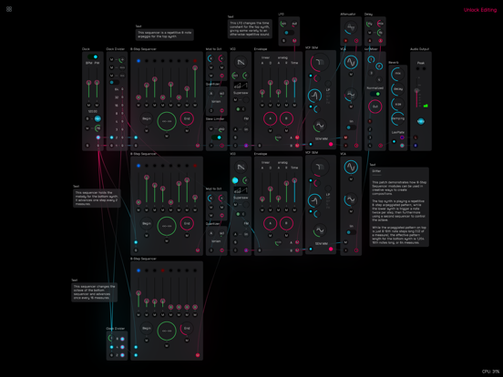 Audulus gives you a complete modular environment at no cost. Its clean, fluid interface stays out of the way so you can focus on what matters: exploring sound. A modular playground with room to grow — from first experiments to advanced designs.