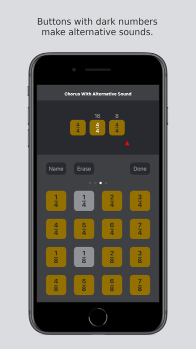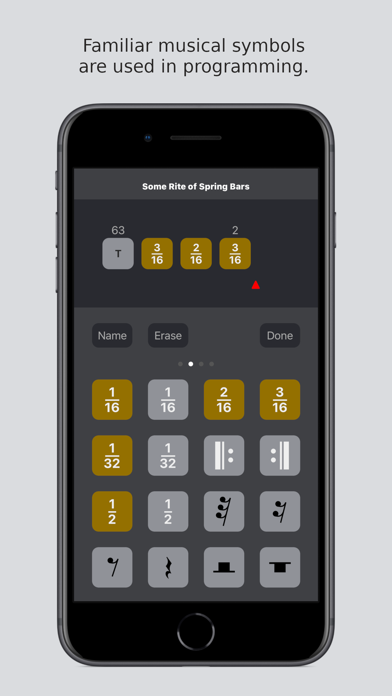 BARBARA has many pages of buttons with which you can create sequences of bars. The buttons are marked with familiar musical symbols. BARBARA is a programmable metronome as its operation is based on the sequences of bars that are created with the buttons.