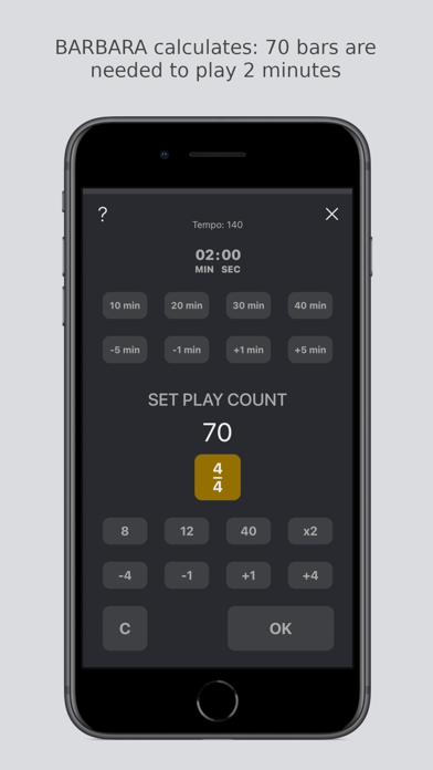 With BARBARA you can quickly create and play metronomic sequences of bars, and the bars can have different time signatures. You can put rests between bars, and you can use alternative metronome sounds for selected bars. You can specify how many times, or minutes, each bar is played.
