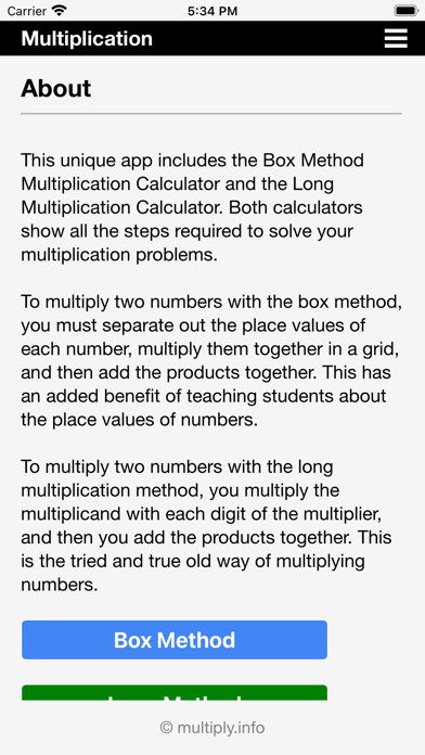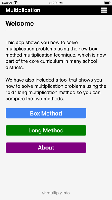 Box method multiplication is now part of the core curriculum in many school districts across the country. This app was created in response to multiple requests from teachers, parents and students wanting an app to help with the increasing popularity of box method multiplication.