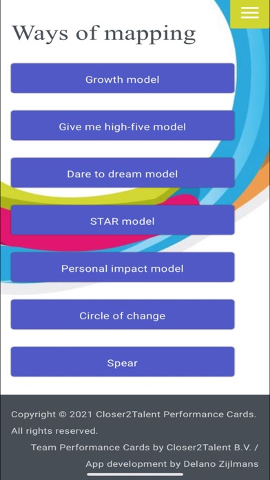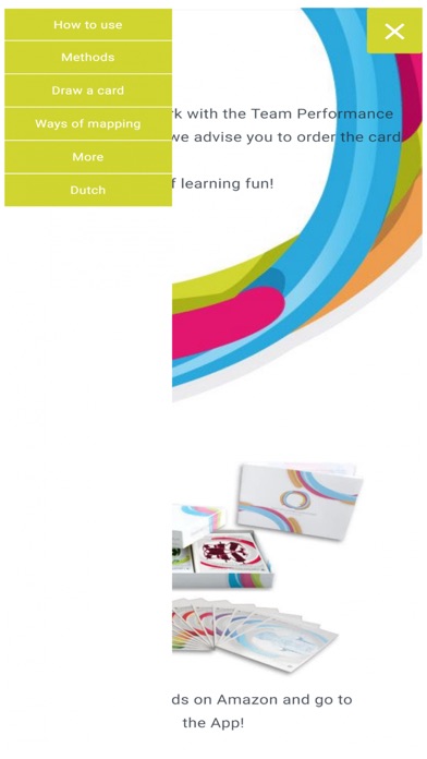 This App is based on the Team Performance Cards. These 108 cards can be used within a team or individually. The focus of this app is to develop yourself. In addition to the general exercise ‘Take a Card’ we also included all other individual ways of mapping coming from the manual of the Team Performance Cards.