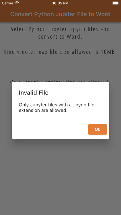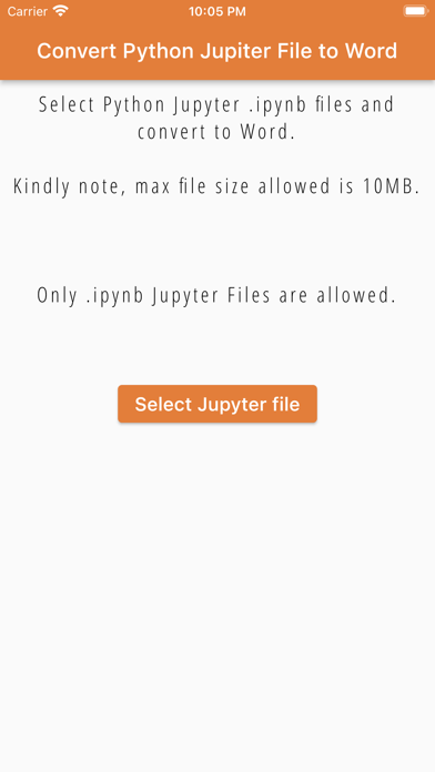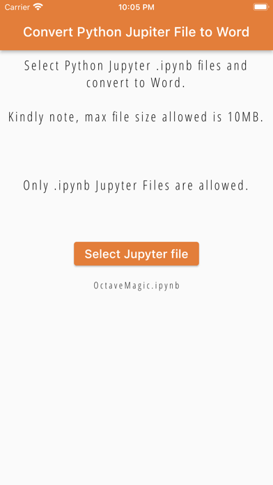 This App allows you to convert Python Jupyter files which are .ipynb files into Microsoft Word .docx format. Just select a file stored in the .ipynb format and then it'll convert and prompt you to save file in MS Word.
