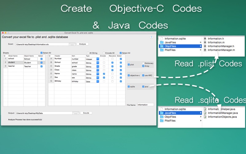 You can convert your datas or configuration from excel document into .plist file or .sqlite database quickly when you develop iOS or Android Apps. And also it will generate corresponding access codes by Objective-C and Java.