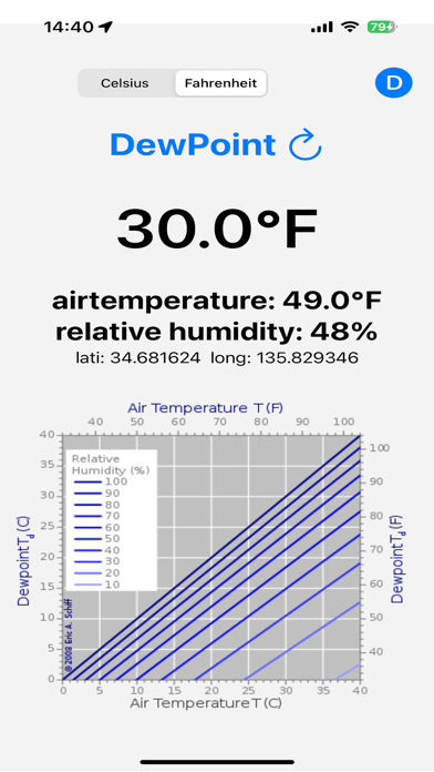 DewPoint Hygrometer displays the dew point, air temperature, and relative humidity at your current location.