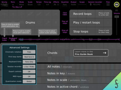 Choose from all 12 keys, 7 diatonic modes, and 8 secondary scales (Pentatonic, Blues, Whote-tone, etc.) to facilitate stylistic riffs and melodies. Intuitively learn relationships between notes and chords as you play. See what chord you're playing with realtime indication.