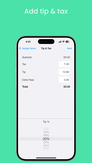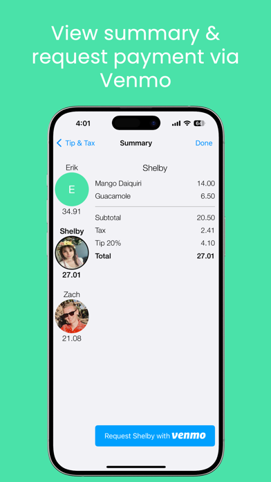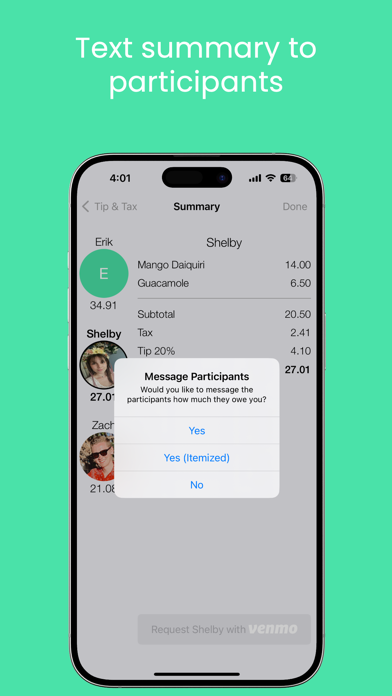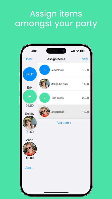 - Assign each item to whomever bought it or split an item amongst multiple participants