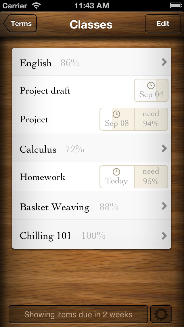 Quickly see all your upcoming due dates and tests for the next couple weeks. Taste the joy of blissful organization.