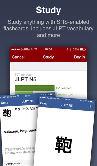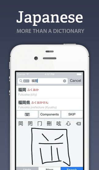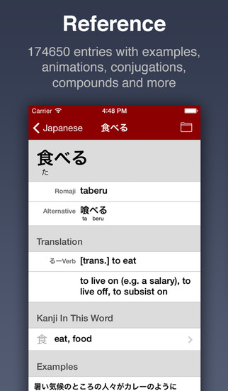 This Japanese/English dictionary is massive, yet easily fits inside your iPhone or iPad. Contains more than 174,650 entries and 52,000 examples, as well as stroke order animations for kanji and kana. Japanese works completely offline, an internet connection is not required. Updates are free.