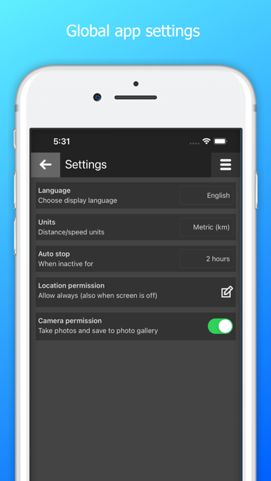 The app gives you duration, distance, speed and altitude as well as your exact position and track lines on a map while tracking. Your position is only tracked when a track has been set up and started and lasts until you stop it.
