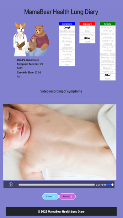 MamaBear is a convenient and easy-to-use mobile health app for parents and caregivers of infants-5 year olds to collect patient-generated health data. MamaBear Health is used to create and maintain a clinical-quality symptom diary over days, months, years, and seasons. The caregiver collects signs, symptoms, sickness exposure, and activity and video with audio and, if applicable, after administration of rescue medication. Our Data Sharing feature ($14.99 for unlimited links over a year) in the MamaBear Health App allows you to share your child's health data securely and conveniently. With just a few clicks, you can generate a unique web link. This link can be shared via email to doctors, family members, or anyone else who needs access to your information. The recipient simply clicks on the link in the email to view your data in a secure web page. No need for them to download the app or create an account. It’s a hassle-free way to keep everyone informed and involved in your health journey.