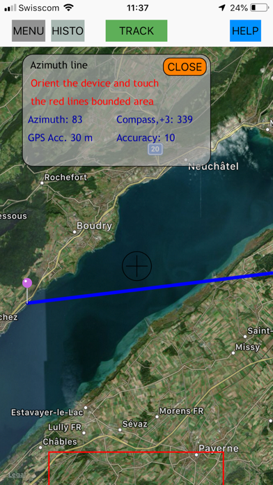 - The distance and the azimuth are displayed