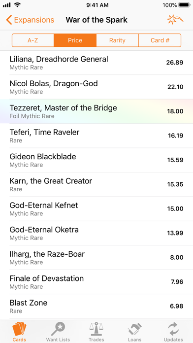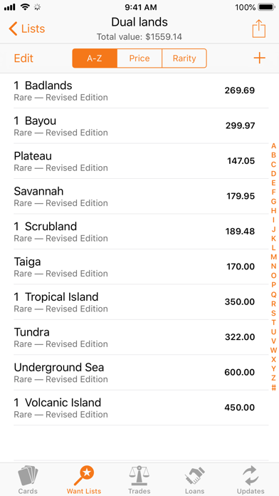 • Want Lists show total value and can be sorted alphabetically, by price or by rarity.