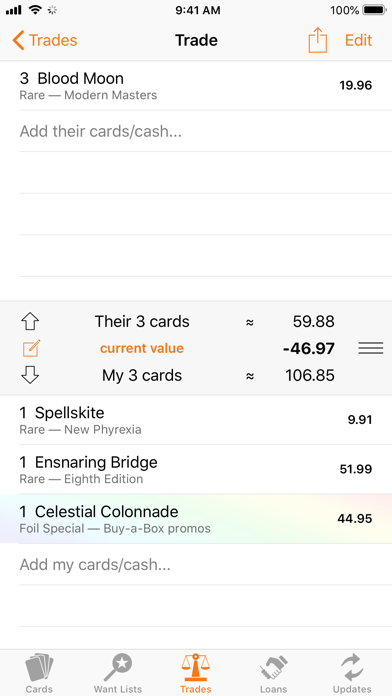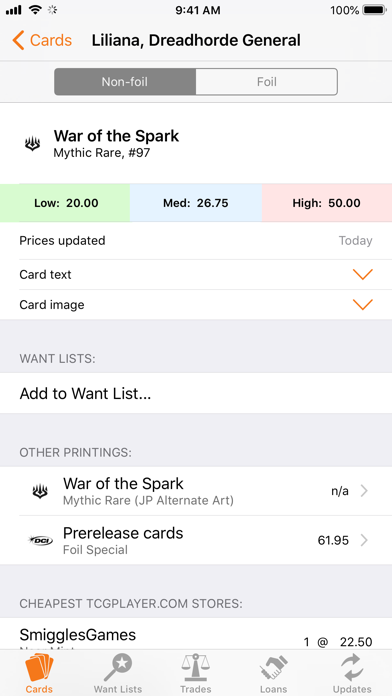 • Save cards to various Want Lists so you always know what you're looking for during trades and how much they're worth.