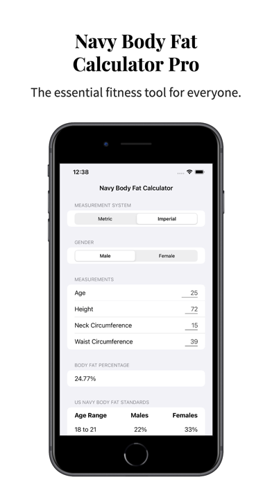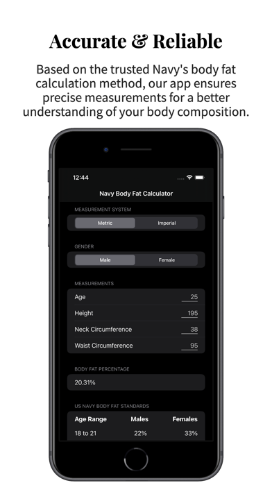 Accurate & Reliable: Based on the trusted U.S. Navy's body fat calculation method, our app ensures precise measurements for a better understanding of your body composition.