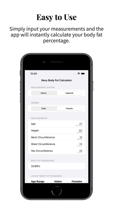 Easy to Use: Simply input your measurements (height, weight, neck, and waist/hips), and the app will instantly calculate your body fat percentage.