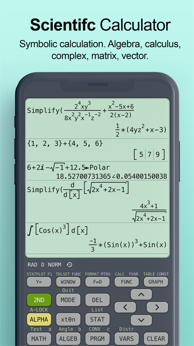 - All basic and advanced math functions, complex number, probability, angle, relational operations, logic operations, matrix and vector operations.