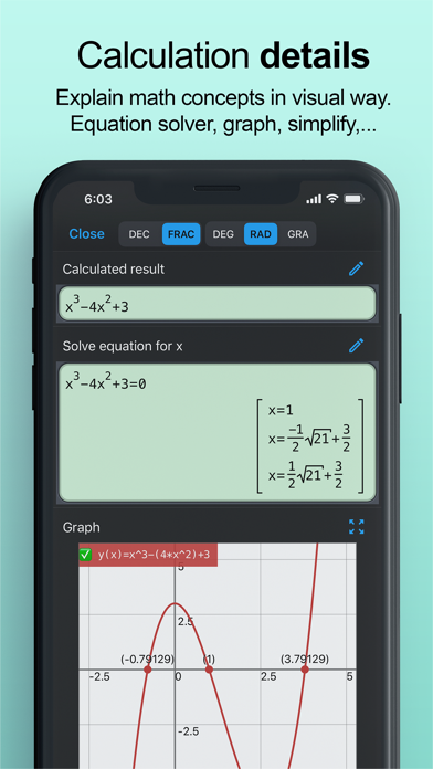 - Solve any equation with auto solver mode, the calculator can give symbolic roots.