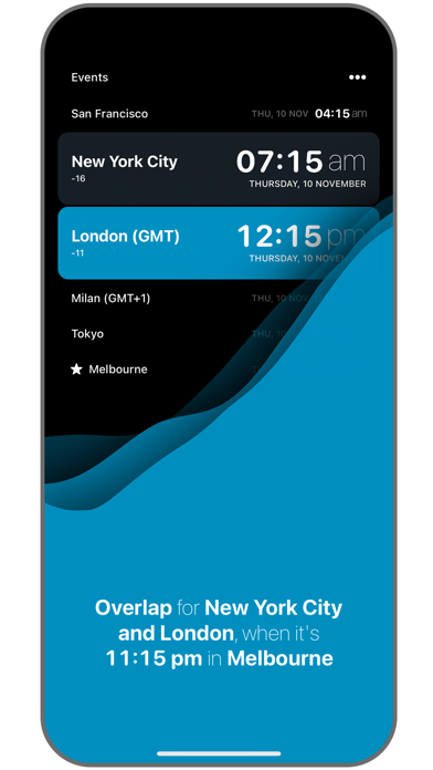 Overlap is a smart world clock that helps you connect with people in different time zones. It makes it simple to see the time in multiple places at once, and its fun Overlap Graph is a unique visual way to quickly find convenient meeting times across the world. You can choose ‘available’ hours for each time zone. For example Dan in London might be available from 2pm to 5pm and Rashida in Sydney might be available from 7am to midday. Bring up the Overlap Graph and it will magically show you the most compatible times to schedule your catchup.