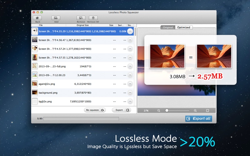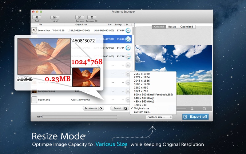 Photo Size Optimizer is a powerful photo resizer and optimizer. It optimizes photos by 80% ~ 20% while keeping original resolution, quality in png, jpg, gif formats. It makes it easy for you to store & transfer files without visible quality loss.