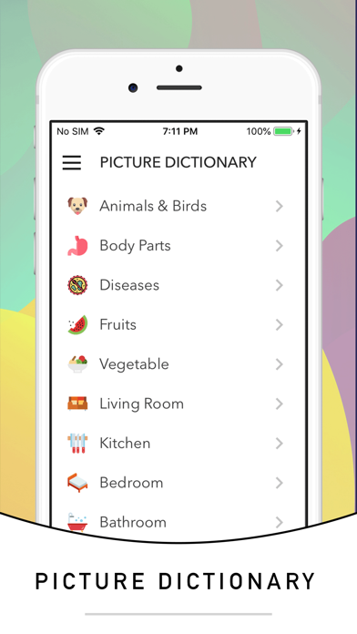 - 3000+ words with pictures for People & Relationship, The Family, The Human Body, Vegetables, Fruits, Meat, Poultry and Seafood, The Supermarket, Containers, Quantities, and Money, Restaurant Verbs, Outdoor Clothes, Everyday clothes, Describing the Weather, House, The Living Room, The Dining Room, The Kitchen, Bedroom, Bathroom, The workshop, City, Library, Vehicle, Transportation, Birds, Fish & Reptiles, Classroom, Lab, Maths, Farming, Sports, Musical, Dance, Animals & Space, Activity