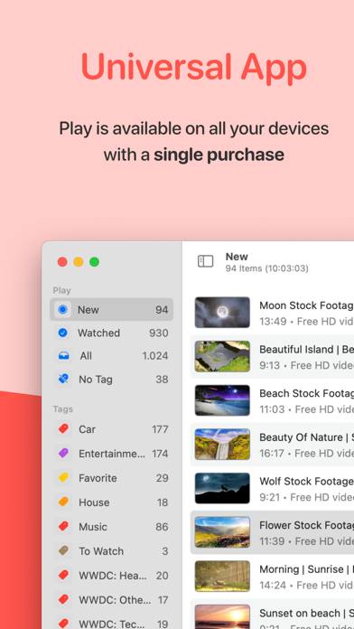 Play is your app for saving and organizing videos for later, keeping up with YouTube subscriptions, and watching with powerful features. Critically acclaimed by The Verge, Daring Fireball, 9to5Mac, MacStories, Mac Power Users, iMore, AppAdvice, and more.