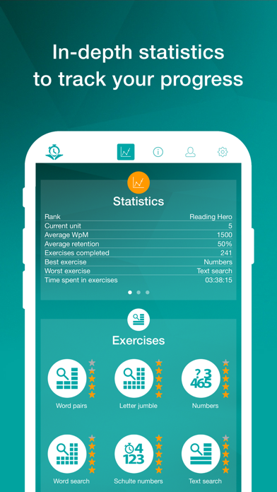 The results of each training exercise are charted for your review. More stars mean that you are getting closer to your objective: more effective reading skills and with it extremely high reading speeds.