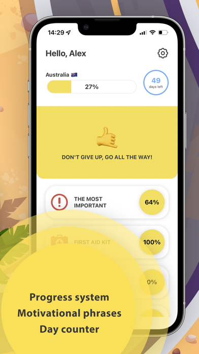 For even better preparation, we have implemented motivational phrases, a progress system, a day counter in the application. Motivational phrases will help you not get bored and will in every way motivate you to reach the end of the goal. The progress system will show you the overall readiness as well as the readiness of each list category. The days counter will help you calculate the number of days left until your trip or any other event. The Ready to Ride app has a sound and vibration accompaniment that will be nice to combine with the process of working in the application.
