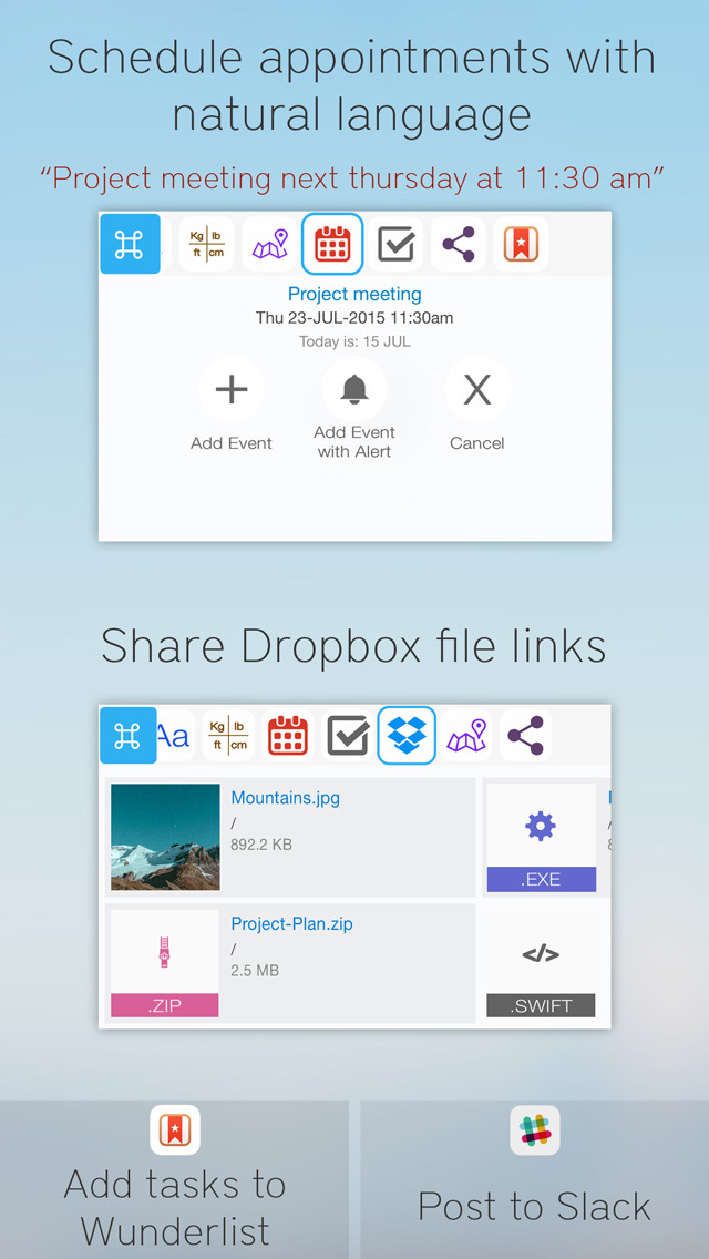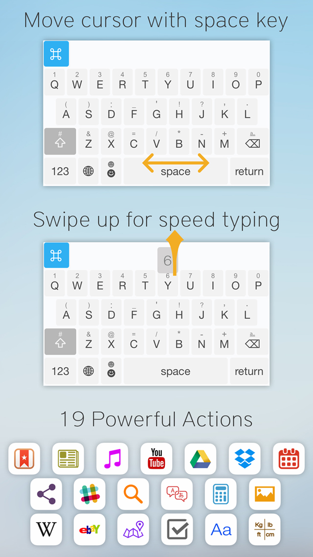 ReBoard has 19 powerful & easy-to-use actions (like: Calendar, Dropbox, Image search, Calculator etc.) embedded in the keyboard itself.