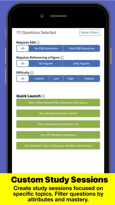 ▸ Create custom study sessions that include or exclude questions that require referencing figures, the use of a flight computer, or that have already been answered. Great for iPhones and on the go studying.