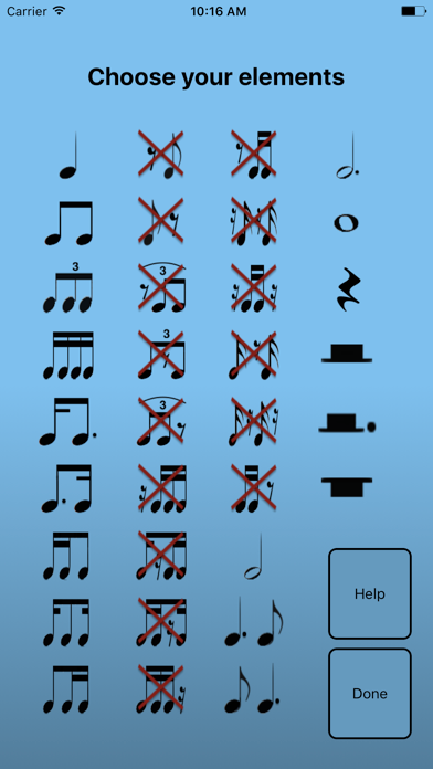 For beginners, including young children, you will select a few elements only (for example: quarter note, half note and half rest), then add other ones, one at a time, only when the success rate at this level is high enough.