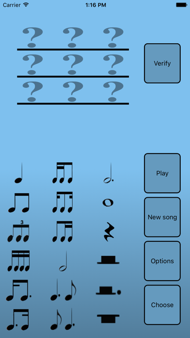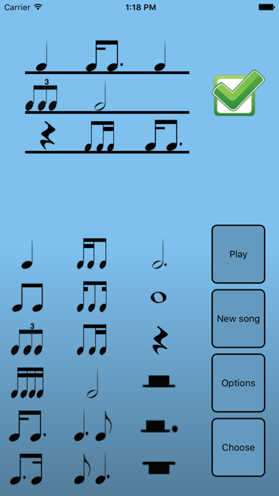 Whatever your current level is, anywhere from beginner to expert, this application facilitates training for an important part of musical education: rhythmic musical dictation. By listening to randomly generated melodies and reproducing their rhythm using the rhythmic blocks you chose to practice, you'll get better and work your way up to more rhythmic elements, longer sequences and higher tempo, making you a better musician!