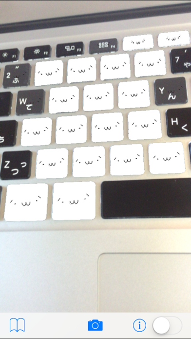 Shobonizer spots everyday rectangles — keyboard keys, sticky notes, screens, signs, boxes — and stamps them with the classic Japanese "shobon" face ω. The result: any boring view becomes an army of gently disappointed ω stickers.