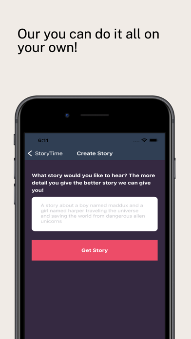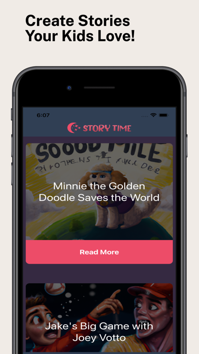 StoryTime let's you and your kids create memories as you come up with new, unique stories each night at bed time. You can save all your stories to come back to later or you can create new ones each time. We use the best and latest artificial intelligence to provide you with your stories and the accompanying art work!