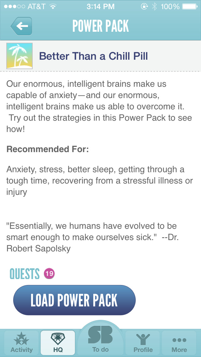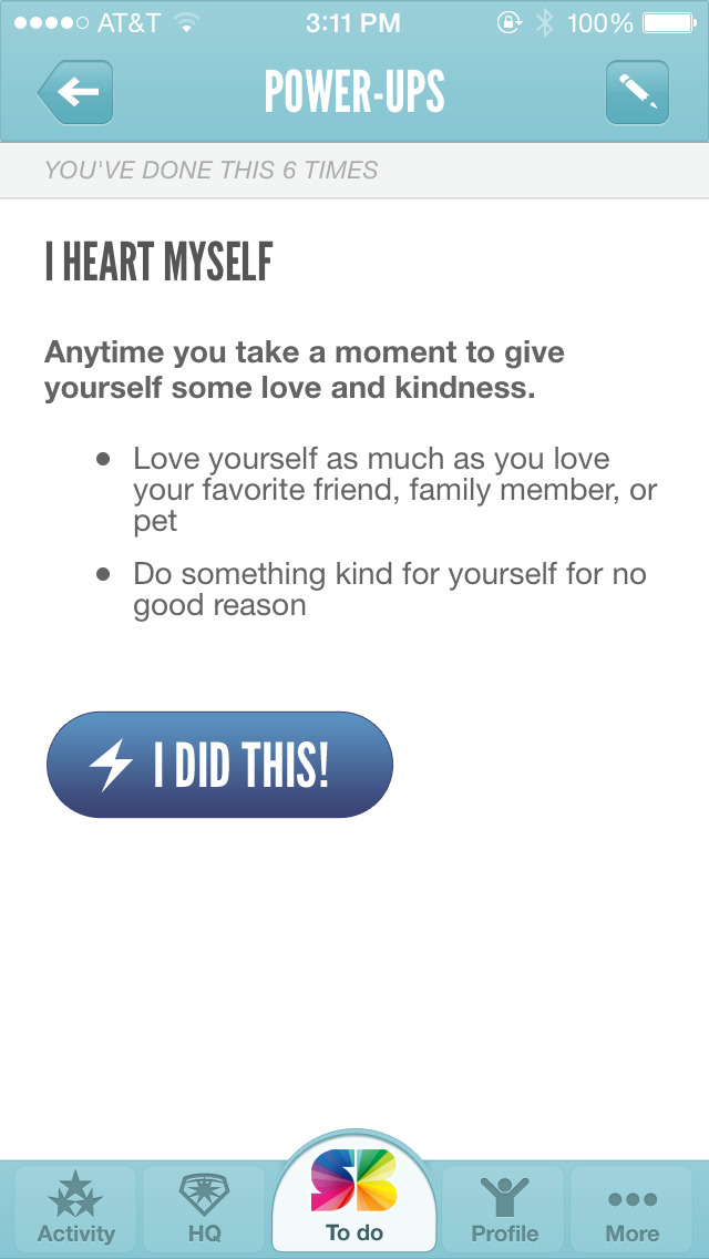 • A randomized controlled study conducted by the University of Pennsylvania found that playing SuperBetter for 30 days significantly reduces symptoms of depression and anxiety, and increases optimism, social support, and player’s belief in their own ability to succeed and achieve their goals. They also found that SuperBetter users were significantly happier and more satisfied with their lives.