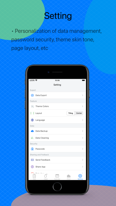 5. Settings: can export data, set password, change theme, backup data, etc.