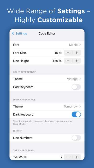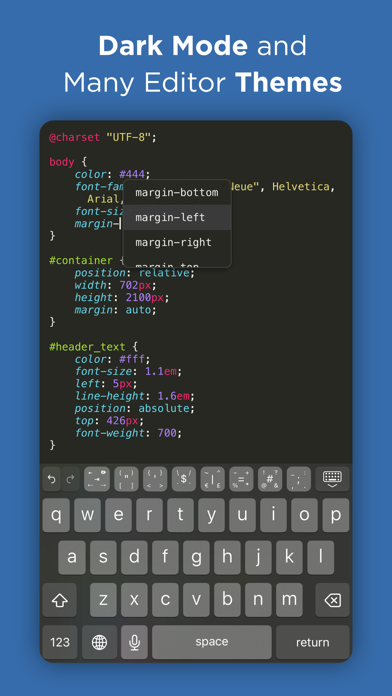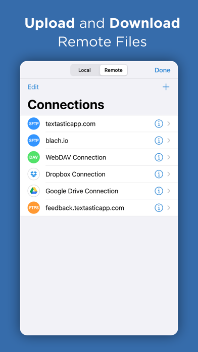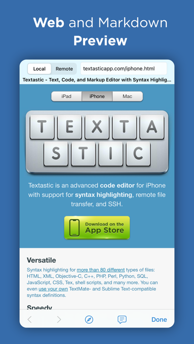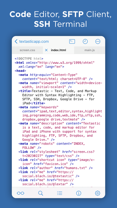 Textastic is a comprehensive and versatile text and code editor for iPad and iPhone. It supports syntax highlighting of more than 80 programming and markup languages. Connect to SFTP, FTP, and WebDAV servers or to your Dropbox account. Use the built-in SSH terminal to work directly on your server.
