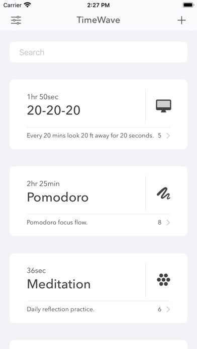 • 20-20-20 Rule — create a timewave to follow the 20-20-20 rule (Every 20 minutes look at something 20 ft away for 20 seconds) while working with screens to prevent eye-strain.