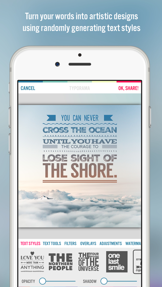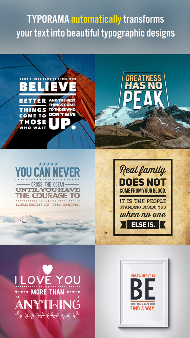 Love typography and making text graphics? Typorama instantly transforms your text and photos into beautiful typographic designs. Just choose a background, type in a few words and your creative typography is ready!