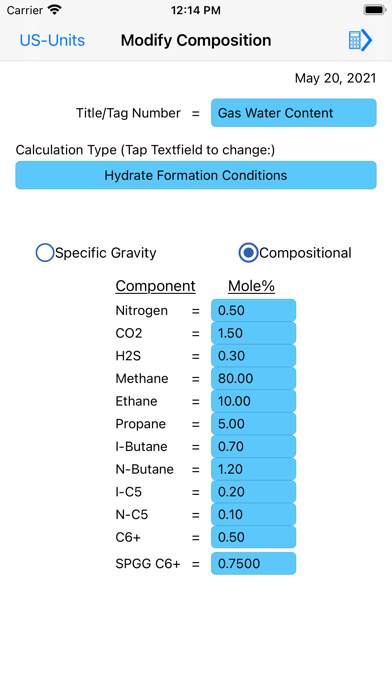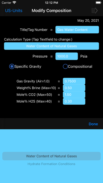 Water content calculations are based on a method developed by Campbell. The method applies the standard physical chemistry equations and the Eykman Molecular Refraction (EMR) combination rules. For water content calculations the approach here uses fugacity coefficient as one of the key factors.