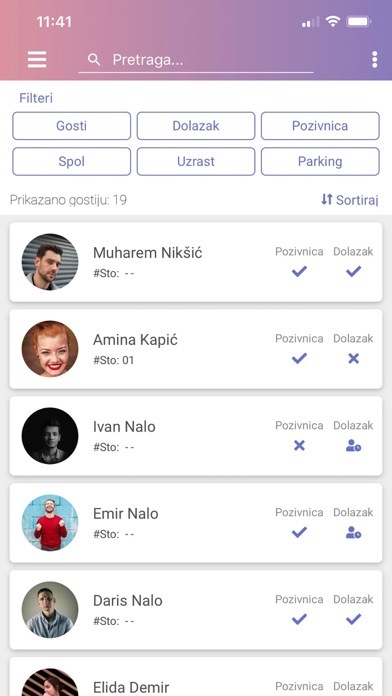 Application has guest management tool that allows you to import guests from your contacts or add new guests manually. You can track guest invitations, confirmations, parking spaces and more. Guest list can be exported as PDF document.