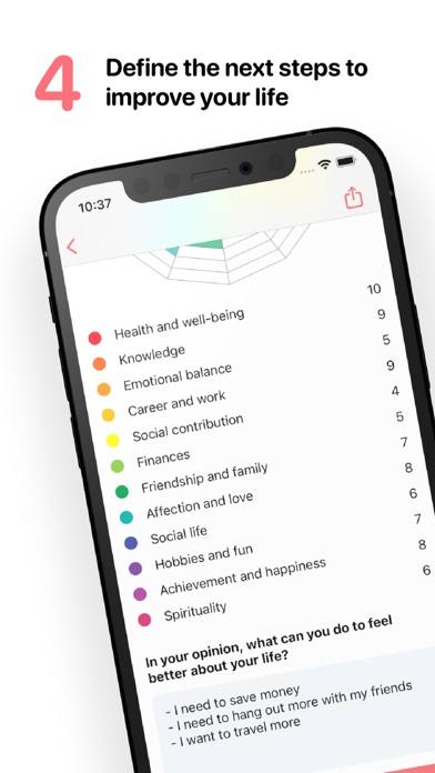 With our app, you can define the categories that matter most to you—like career, family, finances, health, or personal development—and answer a quiz to assess your level of satisfaction in each of these areas. The intuitive and illustrative life balance wheel graph makes it easy to visualize which parts of your life are thriving and which require more care and focus. Whether you're seeking balance in your routine goals, relationships, or professional life, our app offers clarity and actionable insights.
